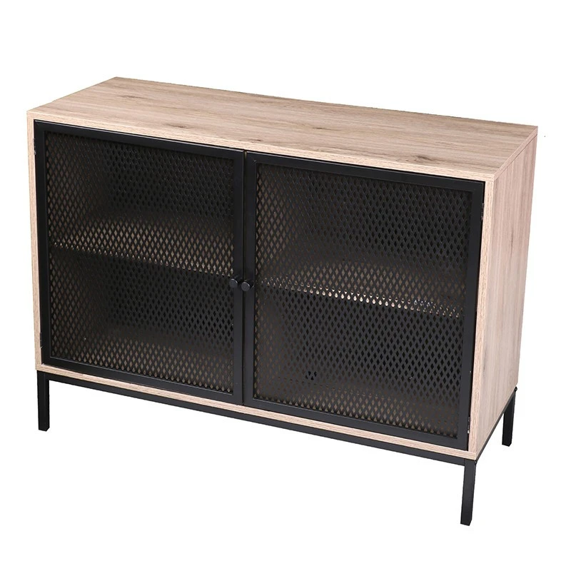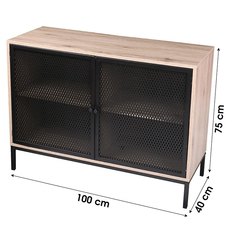 Buffet en mĂ©tal et imitation bois de hauteur 75 cm. Ce buffet est composĂ© de deux portes effet grillage avec Ă©tagère intĂ©rieure. IdĂ©al pour ranger votre vaisselle par exemple.Â