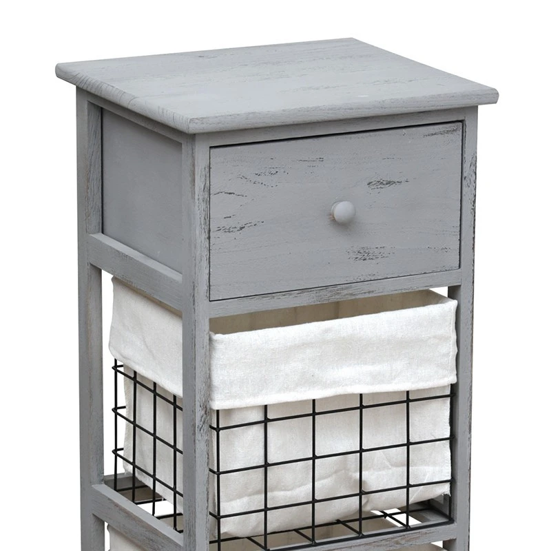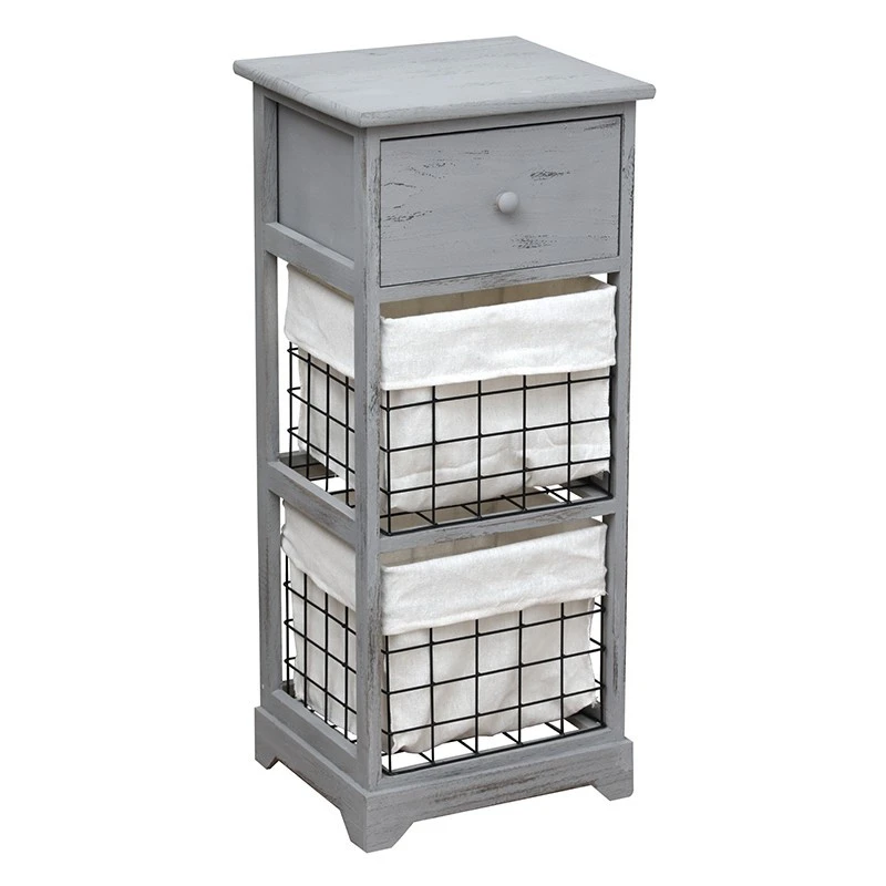 Ce petit meuble en bois est composĂ© de deux paniers en mĂ©tal avec poche ainsi que d’un tiroir en bois. IdĂ©al dans une salle de bain, dans les WC ou encore comme meuble d’appoint dans une chambre.Â